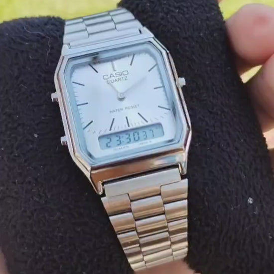 O Casio Retro AQ-230GA traz o equilíbrio perfeito entre o estilo retrô e a tecnologia que marcou época. Seu design analógico + digital chama atenção à primeira vista e transmite elegância, atitude e um gosto refinado.