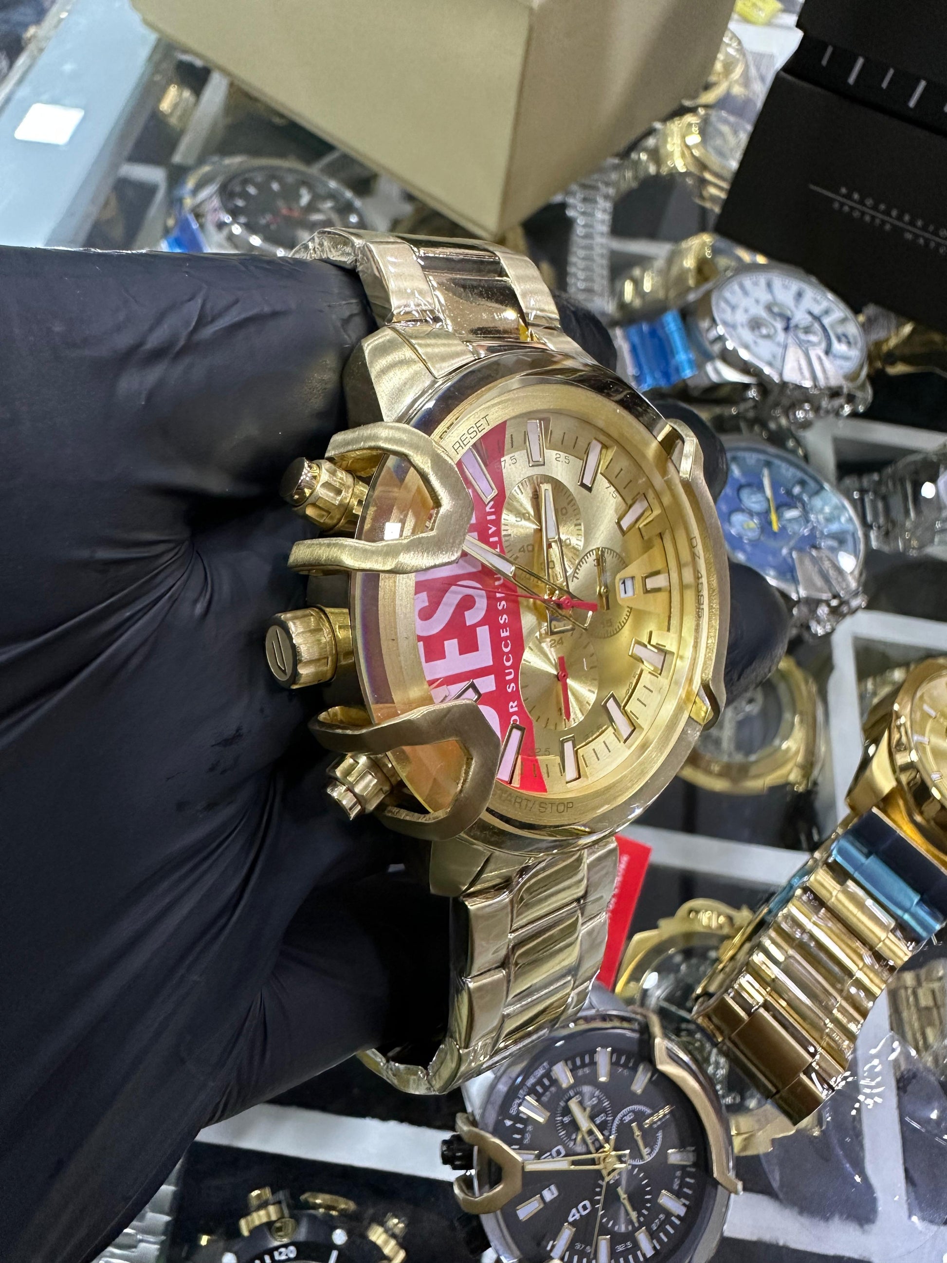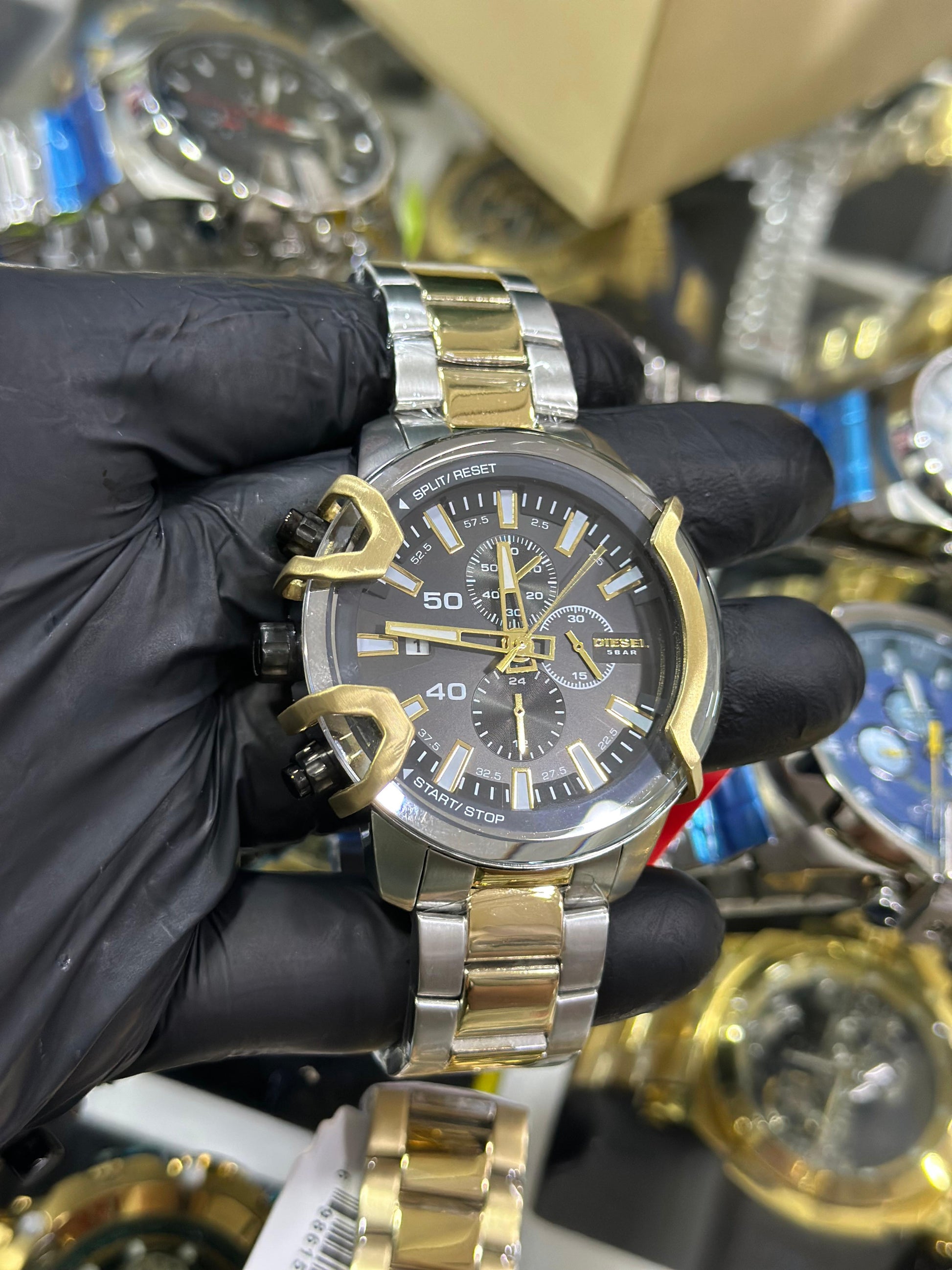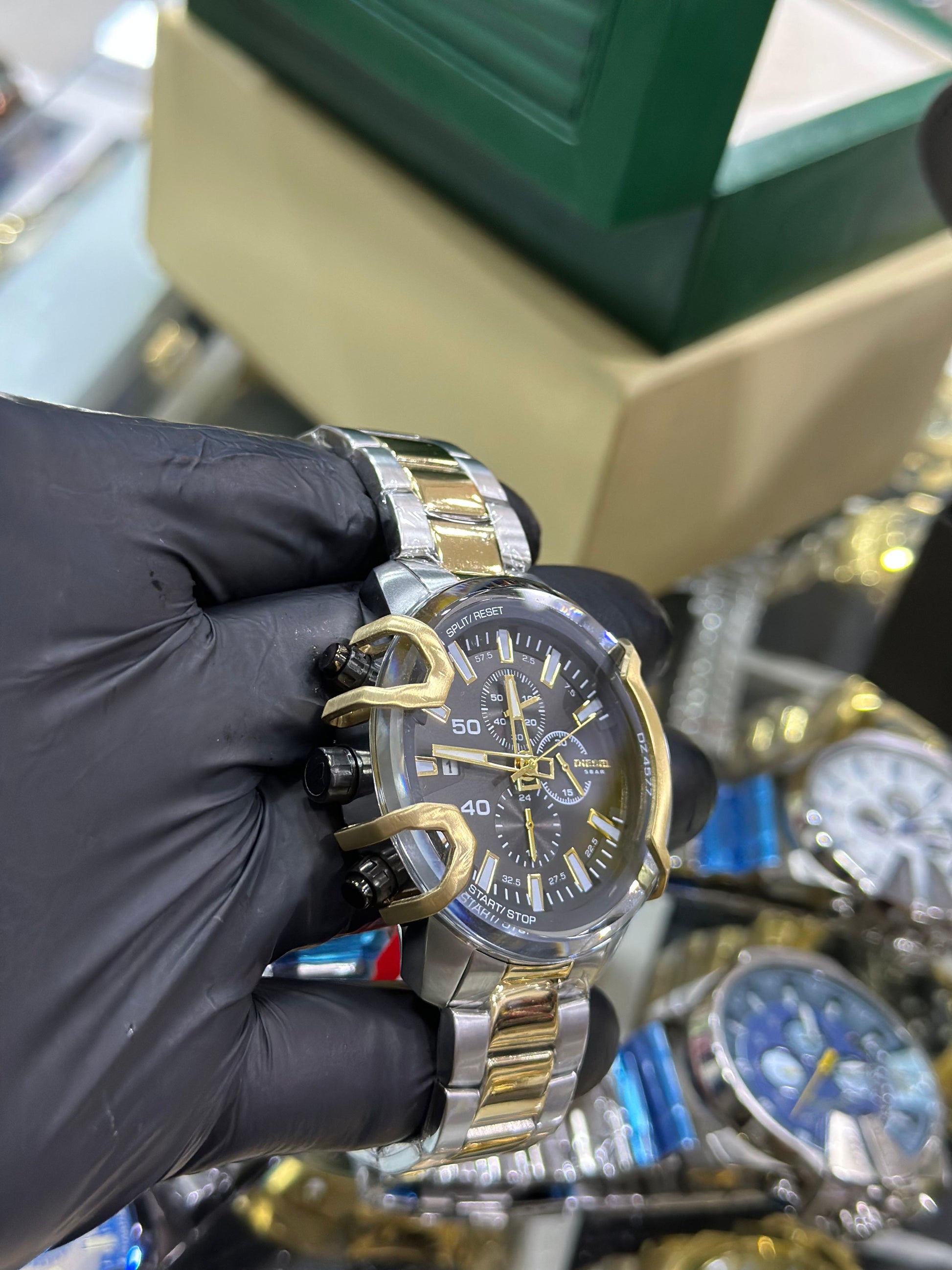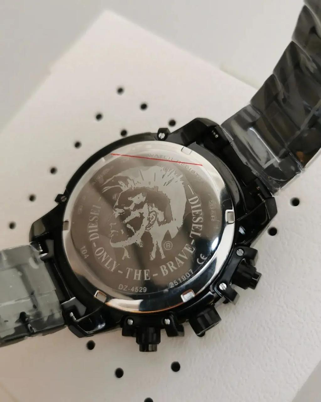 Equipado com cronômetro funcional, data integrada, estrutura em aço inoxidável, resistência à água (uso diário seguro), gravações visíveis da marca Diesel e acabamento AAA+ impecável.