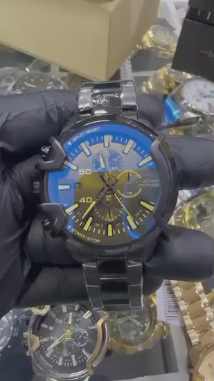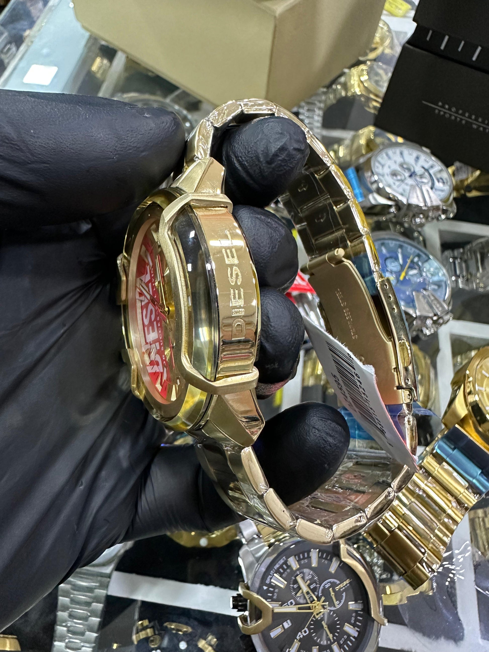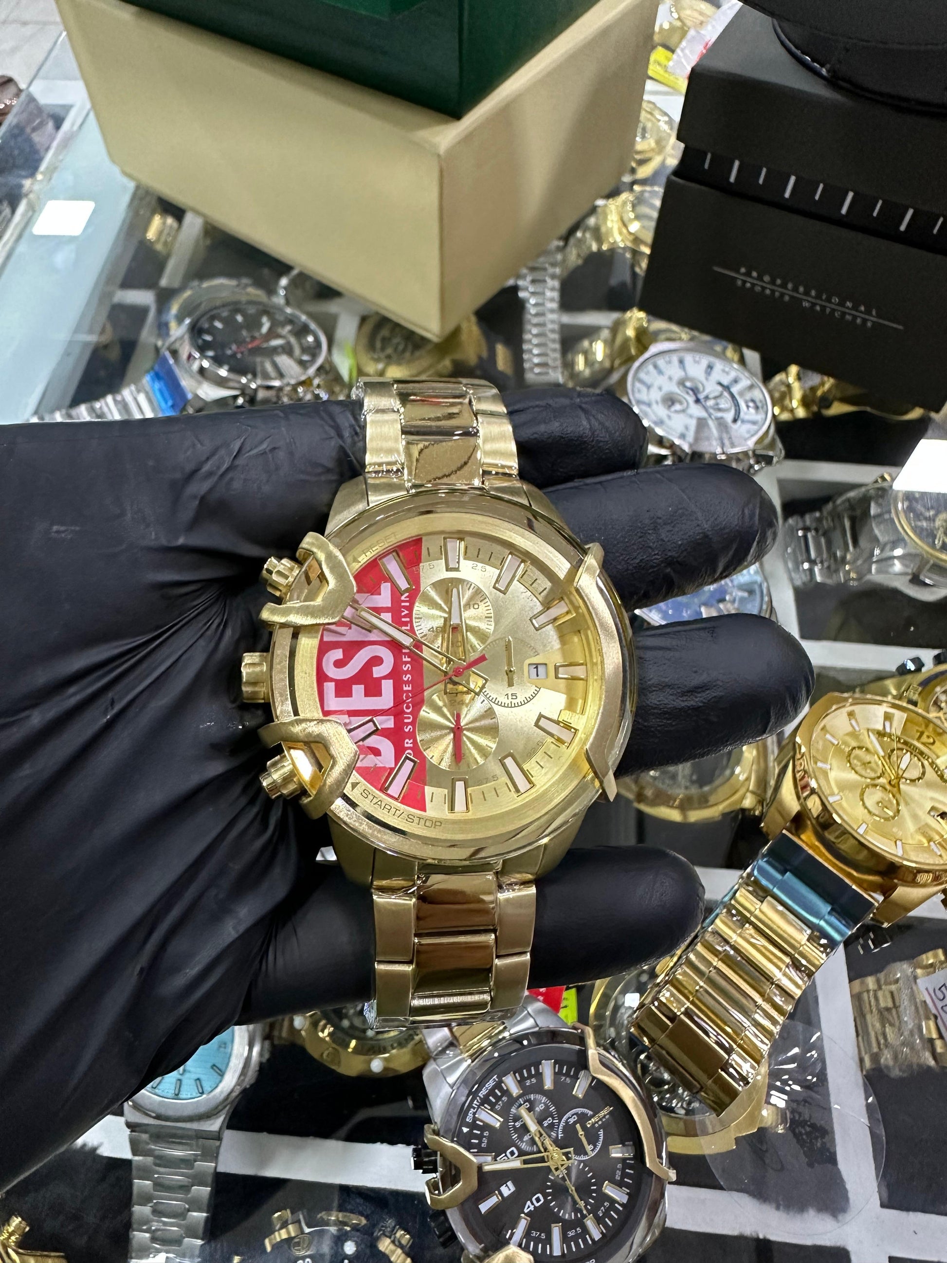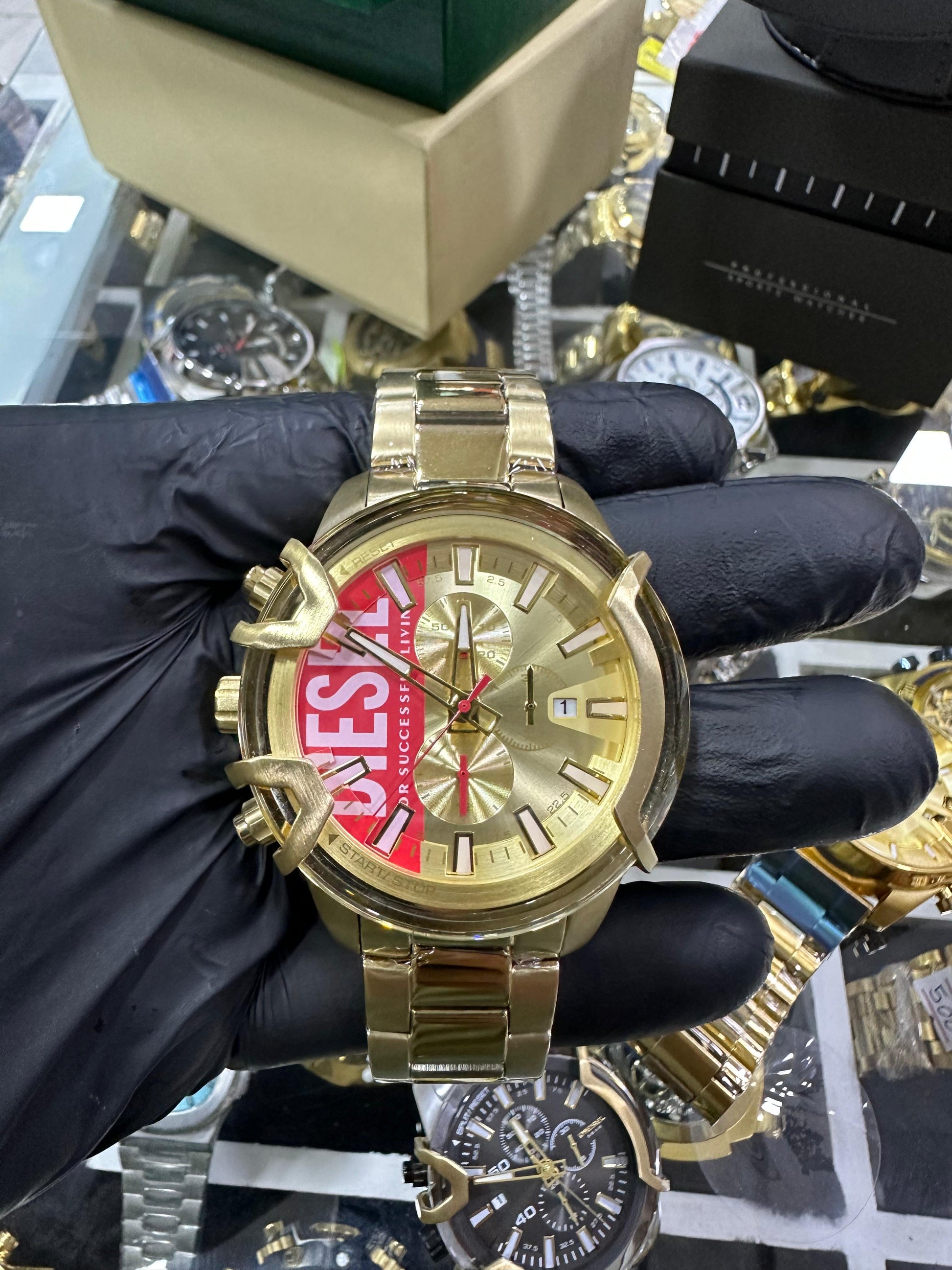Equipado com cronômetro funcional, data integrada, estrutura em aço inoxidável, resistência à água (uso diário seguro), gravações visíveis da marca Diesel e acabamento AAA+ impecável.