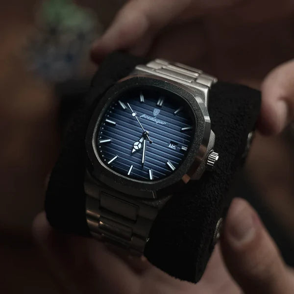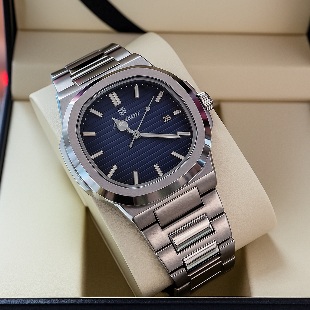 Seu mostrador azul texturizado, aliado à pulseira em aço escovado, cria um visual de alto padrão com presença marcante e luxo silencioso.