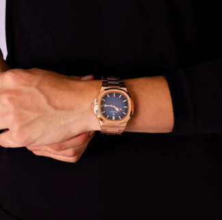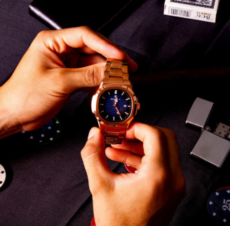 Rocchi Deluxe Golden é a definição de status, presença e sofisticação. Com sua pulseira e caixa douradas, contrastando com um mostrador azul profundo com textura listrada, este modelo transmite luxo absoluto.
