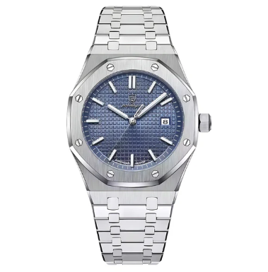 Com design arrojado, mostrador texturizado azul e detalhes metálicos imponentes, ele transmite luxo silencioso e confiança absoluta em qualquer ambiente.
