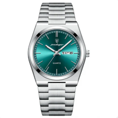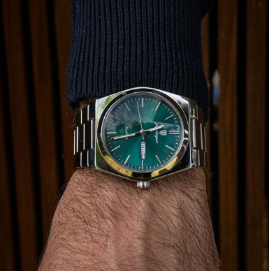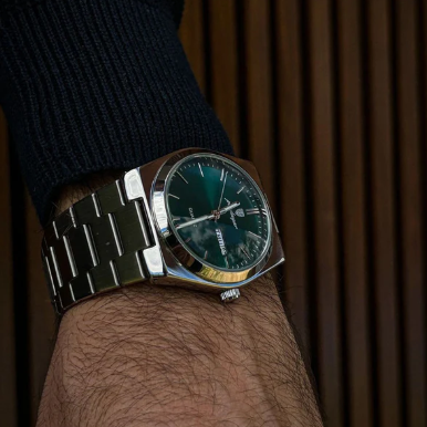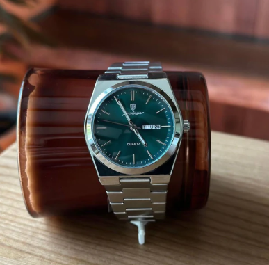 Seu mostrador verde esmeralda profundo, aliado ao design minimalista e pulseira de aço escovado, impõe respeito sem dizer uma palavra.