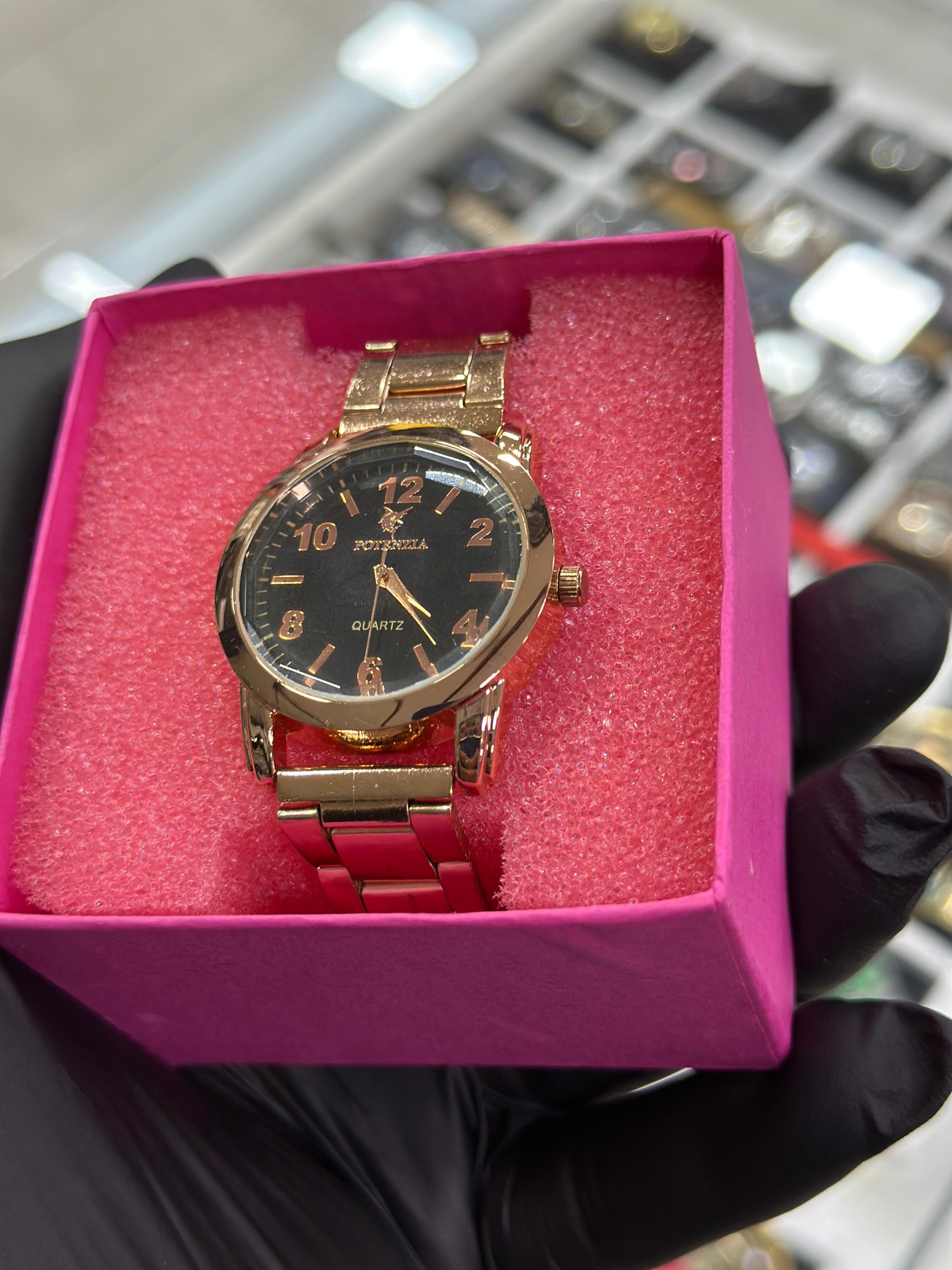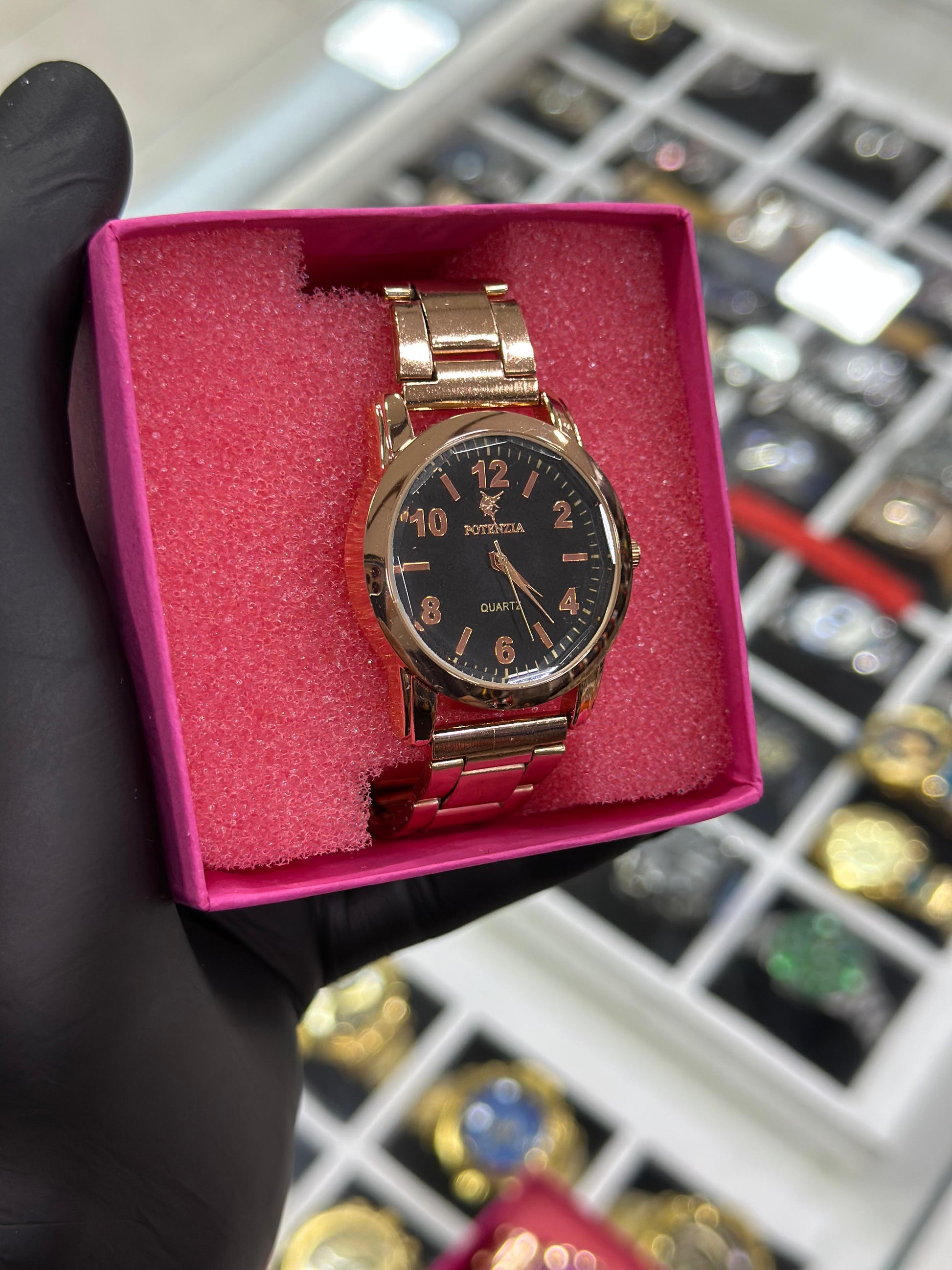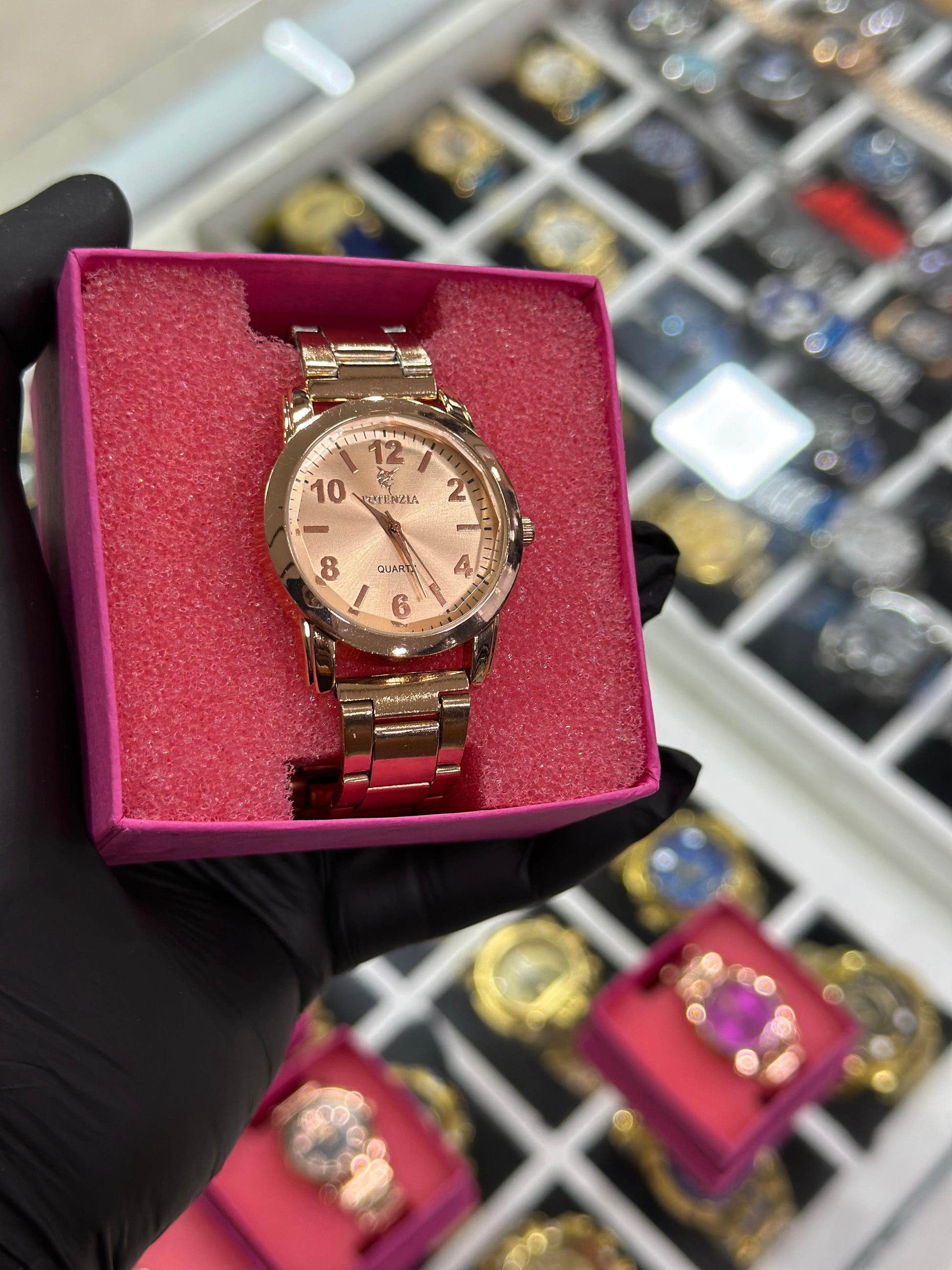Caixa e pulseira em metal rosé premium, com acabamento brilhante e feminino